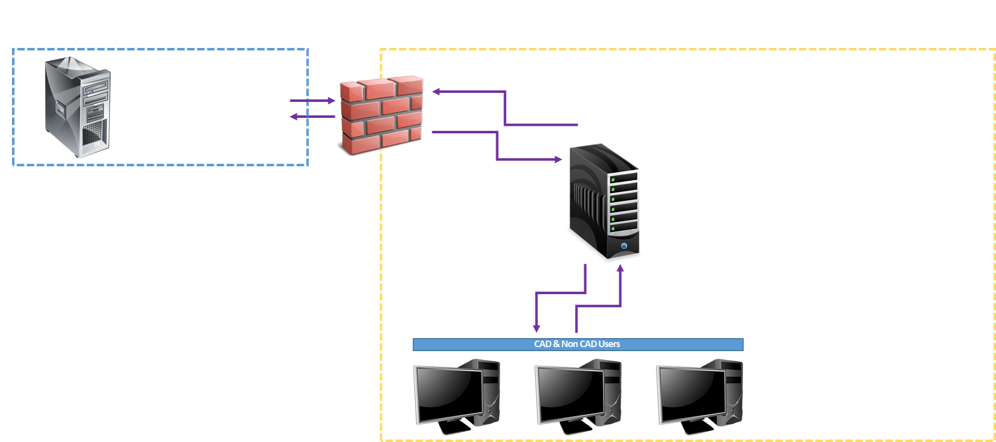 · We create assemblies of the clashing items (with and without surrounding geometry) which can be viewed using a number of free CAD viewer tools therefore allowing your entire team (design, admin, customers, suppliers if desired) to review the data without the requirement for additional expensive CAD licenses.